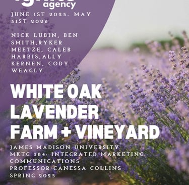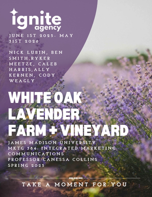 White Oak Lavender Farm is a family-owned lavender farm known for its fields, handmade products, events, and relaxing visitor experience. The business offers products such as skincare, candles, food items, and gifts while also welcoming visitors to the farm. In my Integrated Marketing Communications class, my team created a full campaign proposal designed to increase both in-person and online sales. Our plan included a budget, timeline, social media content, promotional events, and marketing strategies to drive traffic, grow brand awareness, and encourage purchases across both channels.